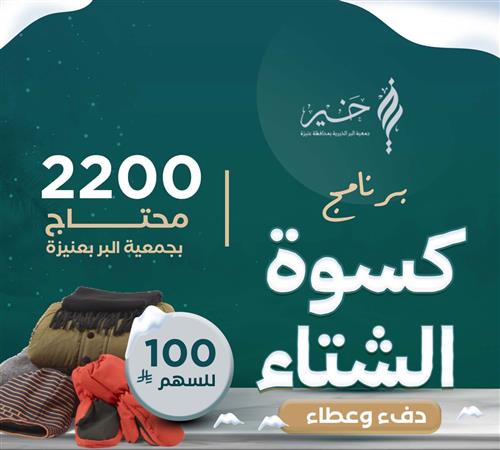 الشتاء على الأبواب.. 2200 محتاجاً من الأيتام والأرامل وكبار السن ينتظرون دفء عطاءك ... لا يملكون ثمن الكسوة. سهمك بـ (100 ريال) هو معطفهم الوحيد ضد قسوة الشتاء...لنكن العون لهم .